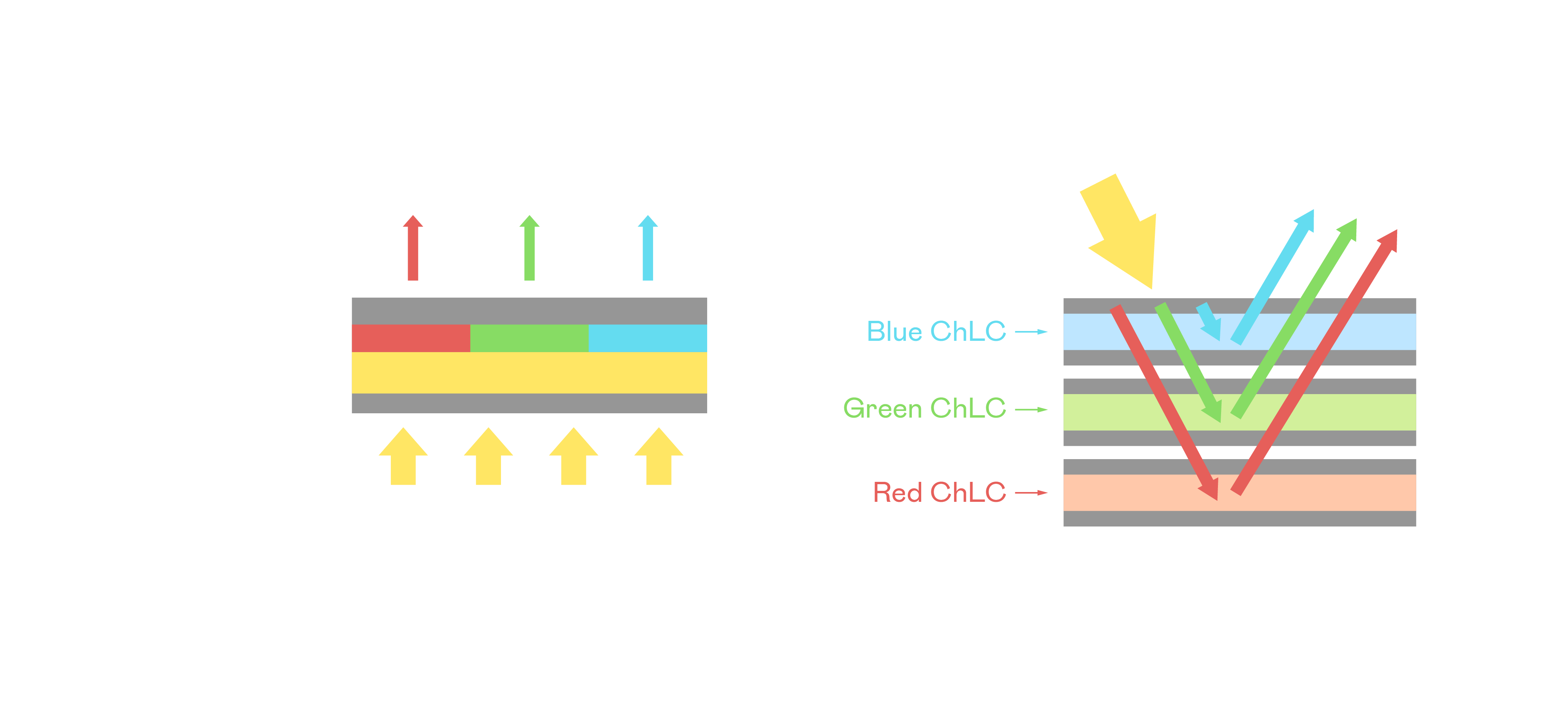 狮子会胆固醇液晶显示器是由红、绿、蓝三层胆固醇液晶面板堆叠而成,并采用无彩色滤光片设计,减少环境光在反射过程中的损耗。